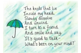 "Weather" Wellbeing Postcard with helpline details for Samaritans, PAPYRUS Prevention of Young Suicide and Shout 85258. Available free of charge and in any reasonable quantity.
